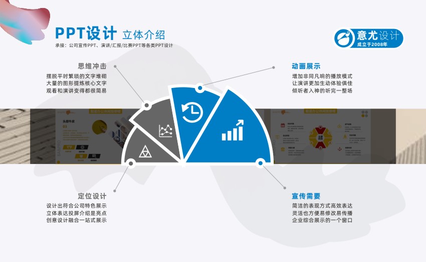 蘇州意尤文化傳播有限公司是一家有著多年廣告設(shè)計(jì)經(jīng)驗(yàn)的蘇州知名廣告企業(yè) 主要業(yè)務(wù)有蘇州PPT設(shè)計(jì)、蘇州產(chǎn)品PPT設(shè)計(jì)、蘇州企業(yè)PPT設(shè)計(jì)、蘇州會(huì)議PPT設(shè)計(jì)、蘇州項(xiàng)目PPT設(shè)計(jì)、企業(yè)VI設(shè)計(jì)、設(shè)計(jì)印刷宣傳冊(cè)/樣本/單頁(yè)/名片等 自2007年成立以來(lái),蘇州意尤廣告公司與蘇州及蘇州各市的幾百家中外企業(yè)進(jìn)行了廣告設(shè)計(jì)合作,經(jīng)過(guò)多年發(fā)展公司已形成了以企業(yè)PPT設(shè)計(jì)、企業(yè)VI設(shè)計(jì),廣告設(shè)計(jì),廣告印刷,樣本設(shè)計(jì),宣傳冊(cè)設(shè)計(jì),名片印刷,菜譜制作,單頁(yè),宣傳單等一批特長(zhǎng)業(yè)務(wù),相信在各位新老客戶的關(guān)心下,本公司會(huì)得到更大的發(fā)展,同時(shí)為客戶的發(fā)展宣傳保駕護(hù)航。